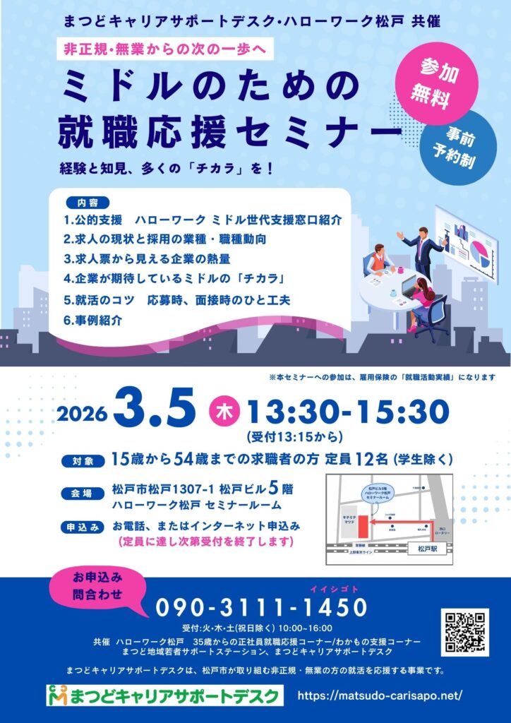 ミドルのための就職応援セミナー 開催日:2026年3月5日(木) 時間:13:30~15:30(受付13:15から) 場所:ハローワーク松戸 5Fセミナールーム 松戸市松戸1307-1 松戸ビル5階 対象:15~54歳までの求職者の方(学生除く) 定員:12名(先着順定員になり次第締切) チラシ(PDF)はコチラ ミドルのための就職応援セミナーお申込みフォーム 先着順定員になり次第締切 必須 お名前 必須 フリガナ 必須 電話番号 必須 メールアドレス 必須 メールアドレス確認用 必須 お住まいの市町村 必須 勤務先の市町村 必須 年齢(15~54歳の方) 15161718192021222324252627282930313233343536373839404142434445464748495051525354歳 必須 現在の状況 現在、無業非正規雇用(雇用保険未加入)非正規雇用(週20時間以上勤務•雇用保険加入)正社員・正規雇用その他 必須 その他の理由をご記入ください。 任意 メッセージ その他お伝えしたい内容があれば、ご記入ください。 必須 私は、個人情報保護方針の取り扱いについて同意します。 ※セキュリティ上の理由により自動返信メールは送信しておりません。担当者からの折り返しの連絡を持って受付完了となります。